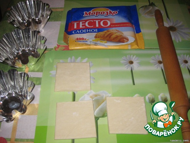 Слоёное тесто размораживаем, и нарезаем на подходящие по размеру форм куски.