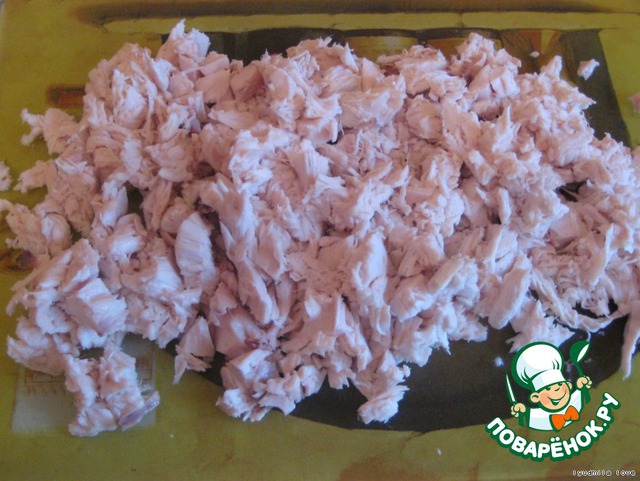 В готовое лукошко первым слоём выкладываем куриное филе.