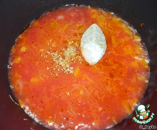 Влить бульон. Добавить лавровый лист, базилик, 0,5 чайной ложки соли, поперчить и довести до кипения.