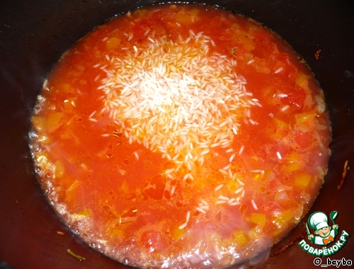 Добавить рис, накрыть крышкой и тушить 15 минут, периодически помешивая.
