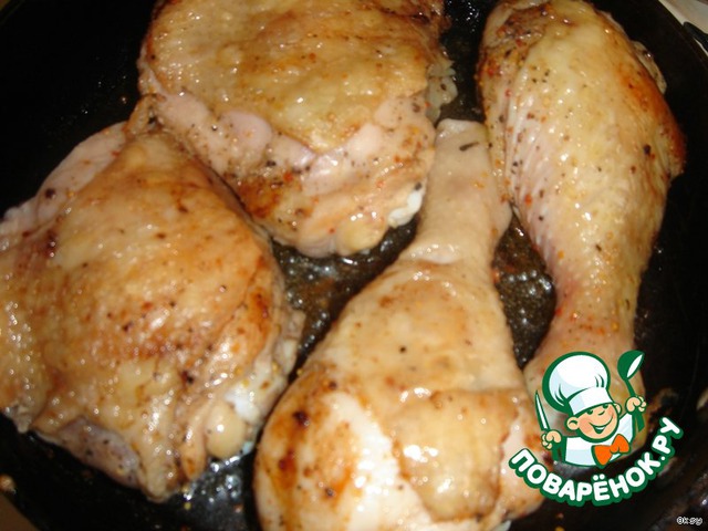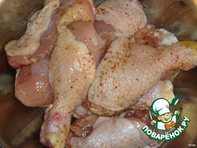 Голени и бедрышки помыть, обсушить, натереть солью и перцем (я использовала смесь перцев).