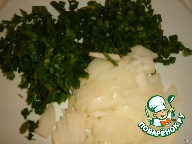 Лук мелко порубить, зеленый лук и петрушку порезать.