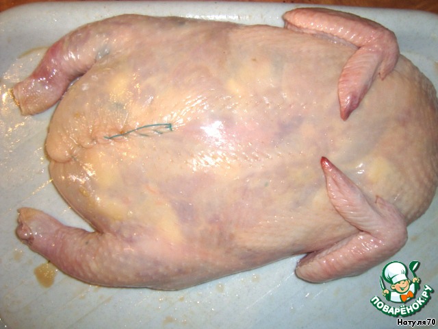 Начиняем шкурку курочки, зашиваем отверстие, через которое укладывали начинку.