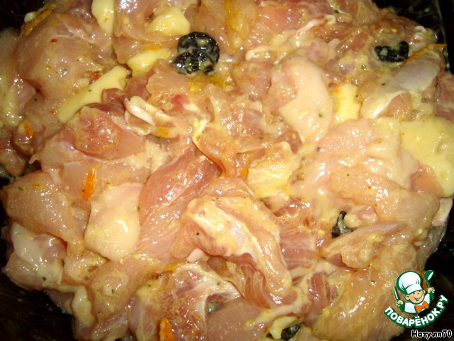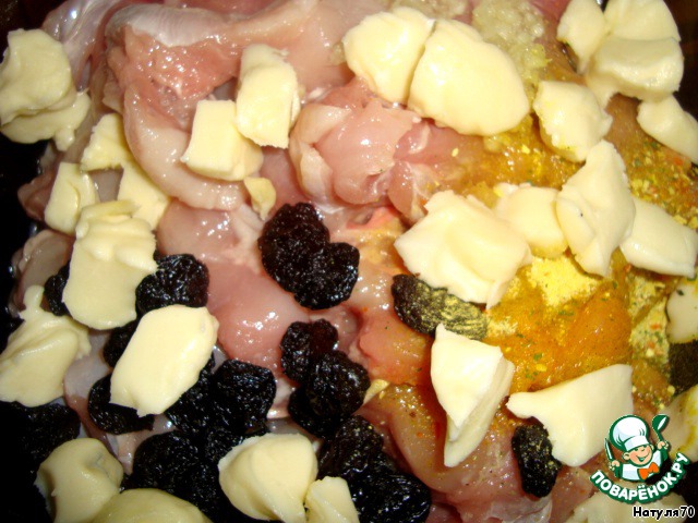 Добавляем изюм, сыр, цедру апельсина, чеснок и приправу для курочки.