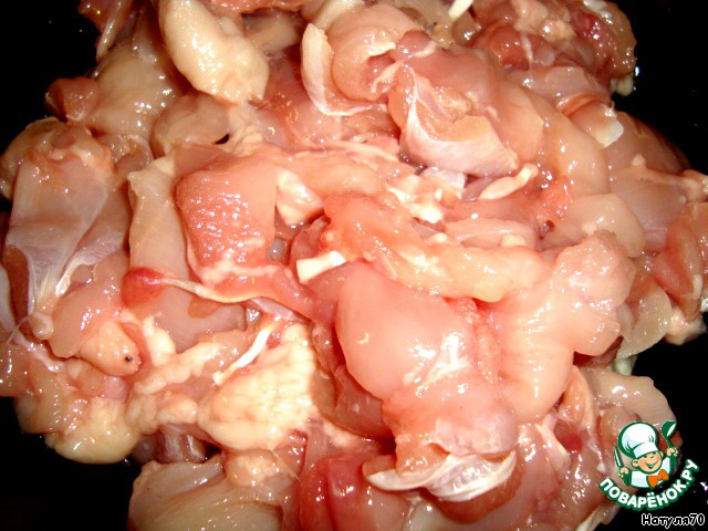 Срезаем мясо с окорочков и курочки, нарезаем его кубиками.