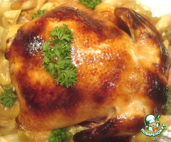 Укладываем курочку на лимончики, выливаем сверху маринад, а оставшийся лимон отправляем внутрь курицы. Ставим в холодную духовку. Включаем ее на 180 градусов. Запекаем полтора часа. Пару раз поливаем курочку образовавшимся соком.