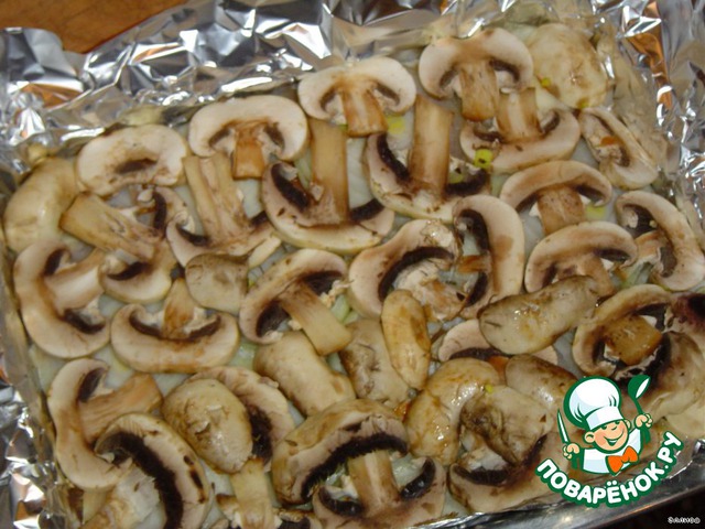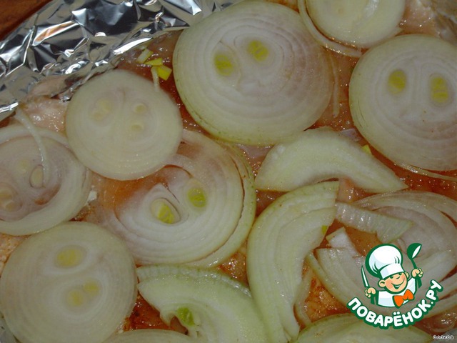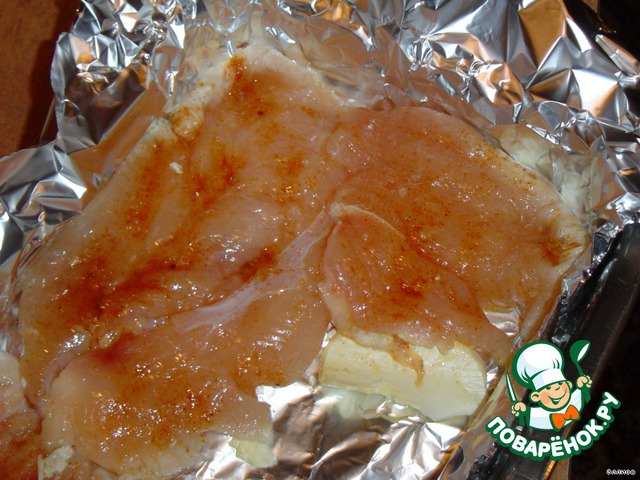 Застилаем противень фольгой и смазываем ее маргарином.На нее выкладываем тонким слоем куриное филе