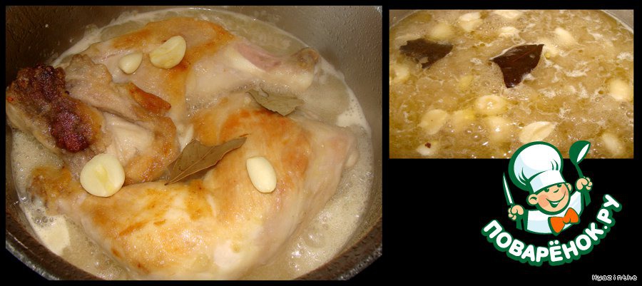 Возвращаем чеснок к курице, вливаем наш бульон из шкурок, вино, кидаем лавровый лист, пробуем на соль, если мало - добавляем, перчим по вкусу, закрываем кастрюлю крышкой, уменьшаем огонь до минимального и тушим курочку 20-25 минут.