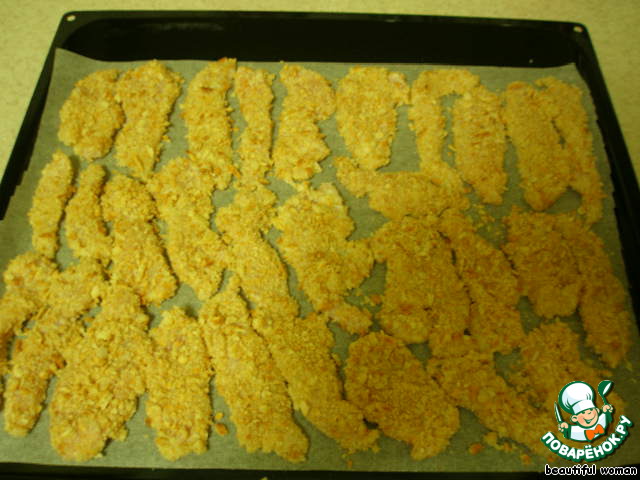 Запанированные кусочки филе выкладываем на противень с пергаментной бумагой. Смазывать растительным маслом не