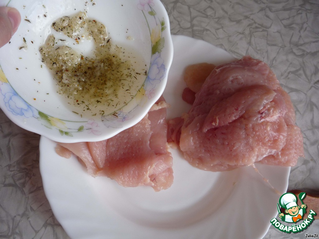 Теперь этой смесью смазываем каждый пласт куриной грудки.