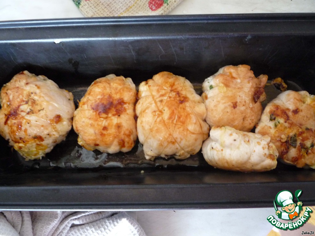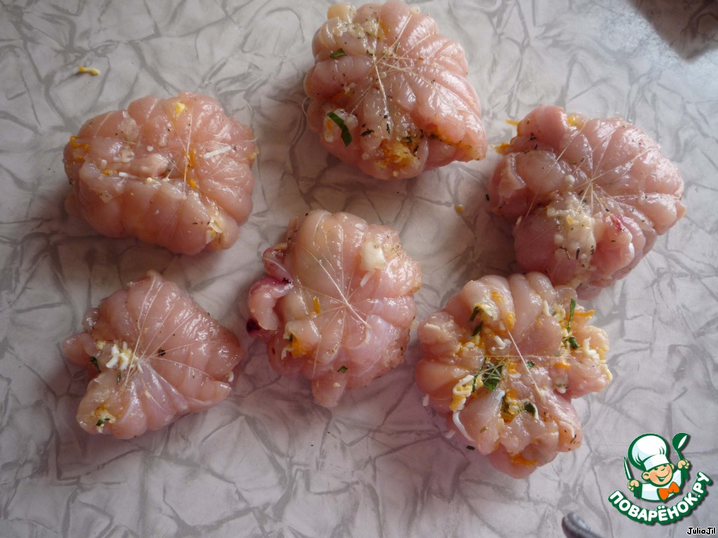 На каждый отбитый пласт грудки выкладываем немного нашей смеси и накрываем ещё одним пластом грудки. А затем обворачиваем всё аккуратно ниткой.