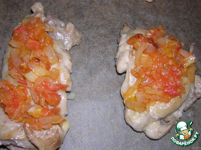 На сковороде обжарить нарезанные мелкими кусочками лук и помидоры (я снимала кожу с помидоров. Положить сверху мяса и в духовку около 25 минут при 180 гр.