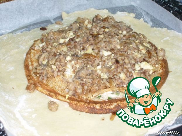 Начнём сборку: 1/3 теста раскатать, выложить на большой противень, покрытый пергаментом, и 1-2 блина