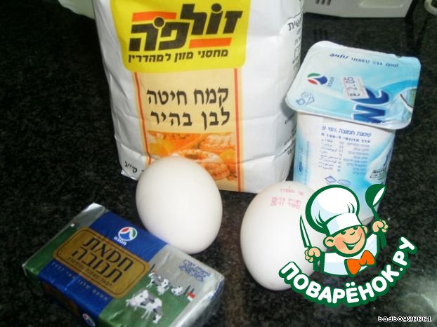 Заняться тестом: 2 ст. муки, 125 гр сметаны, 125 гр масла, 2 яйца, соль.