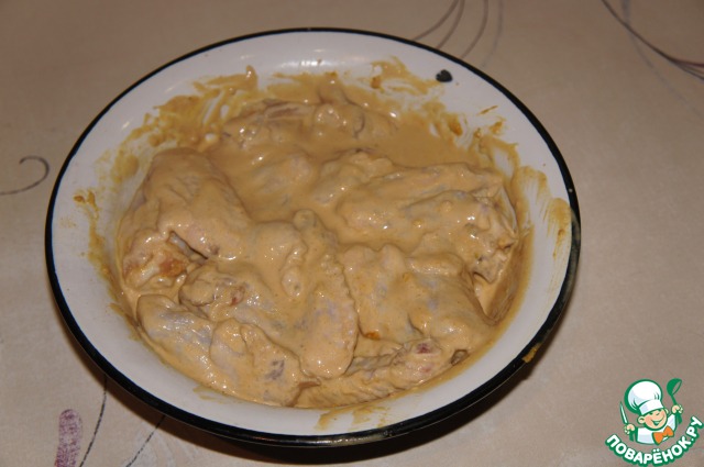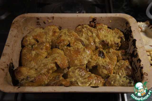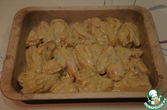 Выложить крылышки одним слоем на противень, сверху немного смазать маринадом.