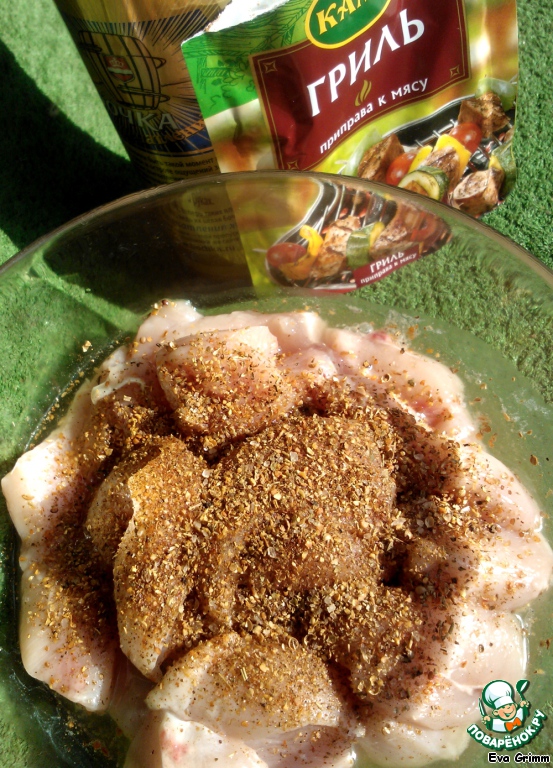 Курочку нарезаем кусочками 3Х3 см примерно, маринуем в пиве и специях, оставляем на 30 минут