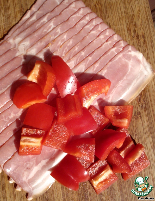 Нарезаем кубиком сладкий перец, подготовим бекон