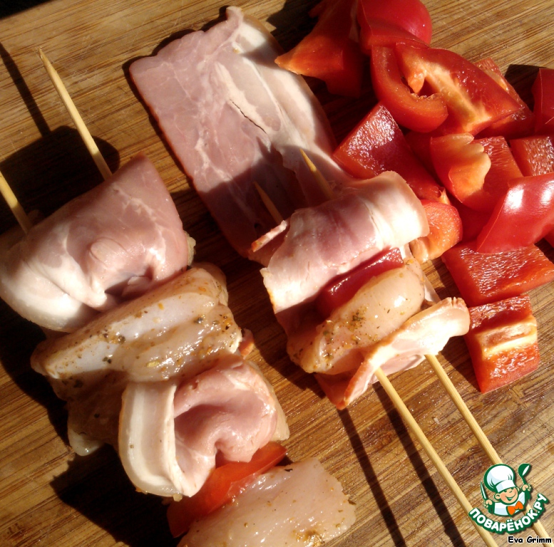 Насаживаем на шпажки вот таким образом курочку, чередуя с беконом и овощами, хорошо будет держаться на 2 шпажках каждый шашлычок