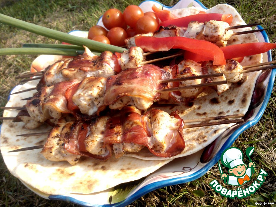 | Я очень люблю куриную грудку и готовлю ее в качестве шашлыка, она всегда получается очень сочной, а если добавить полоску бекона и овощи... очень люблю делать порционно на шпажках... уверяю вас, гости будут в восторге |