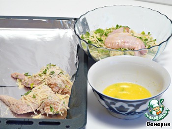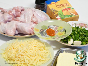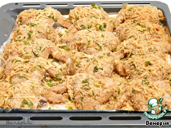 Куриные крылья обмакиваем в сливочном масле и обваливаем в панировочной смеси.