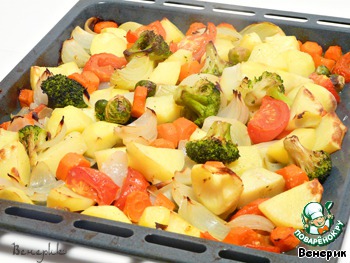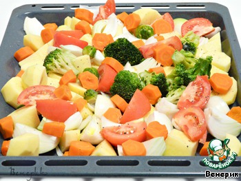 Все овощи кладём на противень, солим, перчим, сбрызгиваем оливковым маслом (перемешиваем всё там же руками) и запекаем в нагретой до 190 гр. духовке, примерно 30-40 минут (у меня духовка с конвекцией, если у вас газовая духовка, то придёться подержать овощи немного дольше, до готовности)