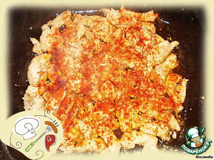 Под конец жарки посолить, поперчить, добавить приправу для курицы и 1 ст.л. паприки.