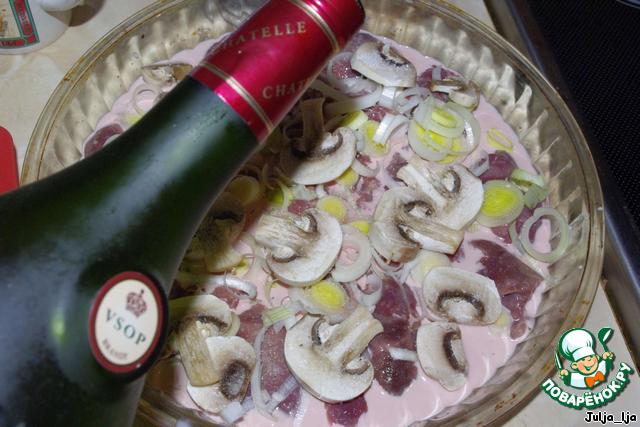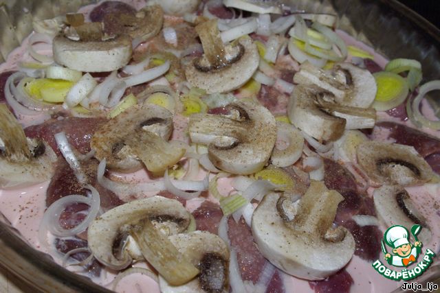 А через сутки печень выложила в огнеупорную форму, вместе со сливками. Добавила нарезанный лук-порей, нарезанные шампиньоны (4шт.). Приправила всё солью, перцем и мускатным орехом.