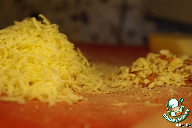 Далее стали заниматься тестом. Это самое любимое занятие малыша. Сначала натёрли сыр (треть от количества) и измельчили оставшийся миндаль, ведь нам нужно превратить обычное слоёное тесто в сырно-миндальное. А это очень просто.