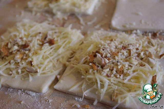 Теперь тесто разрезали на 4 квадрата. 3 из них посыпали сыром и миндалём.