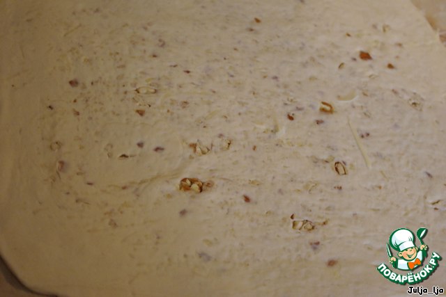 И раскатали скалкой в тонкий пласт. Если слишком тонко раскатать, то от орехов тесто может рваться, поэтому нужно следить за толщиной.