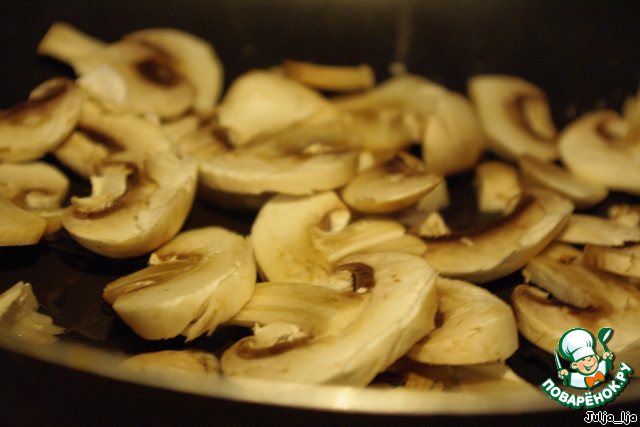 Оставили тесто немного отдохнуть, а тем временем нарезали оставшиеся грибы пластинками и обжарили их (совсем недолго) в небольшом количестве растительного масла.