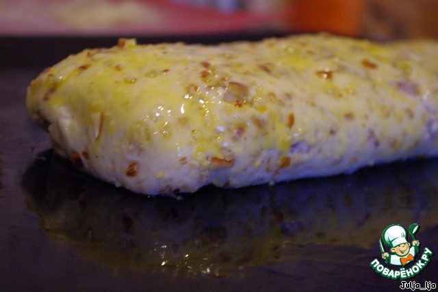 Сворачиваем рулет, смазываем его желтком и отправляем в разогретую до 200 градусов духовку, на 20 минут.