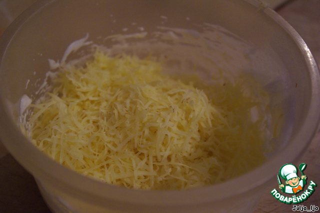 Пока рулет запекается, натрём оставшийся сыр и смешаем его со взбитым в крепкую пену белком (который остался от желтка).