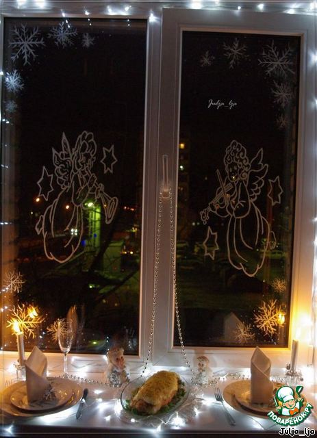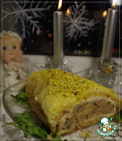 | Ангелы... Мне очень хотелось сделать что-то на тему этих сказочных, а, возможно, и нет, персонажей. Сказки с ними, всегда немного грустные, но очень светлые и добрые. Собственно, сам персонаж - уже олицетворение сказки. Вот и к нам прилетела пара ангелочков и поселилась на окне, а угостить их мы решили нежнейшим рулетом из куриного филе, с паштетом, грибами и орешками. Завернули мы рулет в миндально-сырное слоeное тесто. Ну и, наконец, покрыто это всe, словно крылом ангела, нежной шапочкой из сыра и фисташек. |
