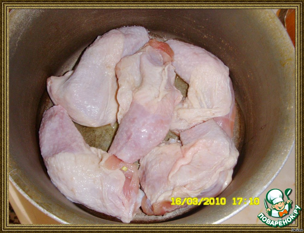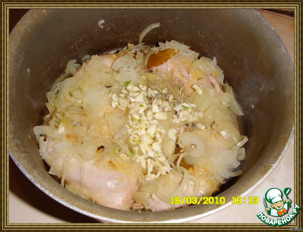 Слова автора. Для этого блюда нужны: крупные куски курицы и крупно нарезанный лук (на 500 гр мяса - 2 луковицы), чуть масла растительного или сливочного для смазки дна кастрюли[i](добавляла оба вида масла),[/i],