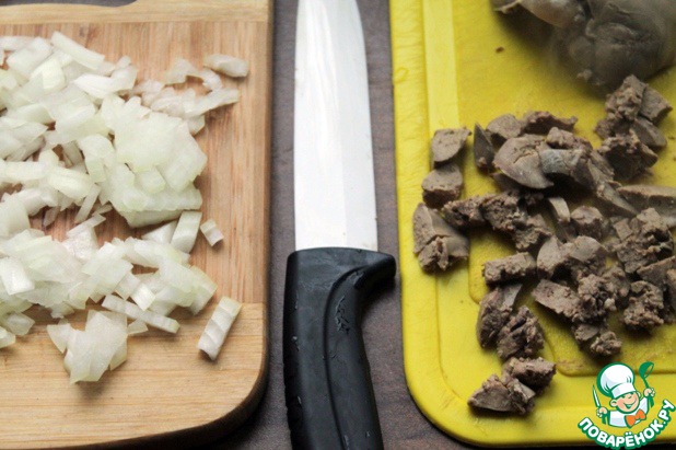 Лук, вареную печень и очищенные орехи мелко нарезать.