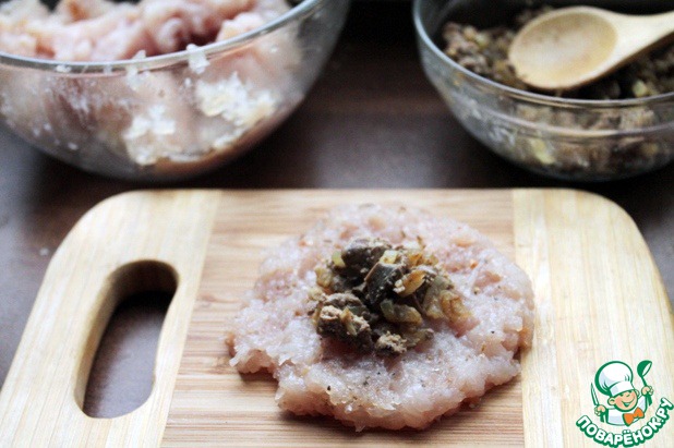 Из куриного фарша сформировать лепёшку, на середину выложить немного начинки и сформировать котлету.