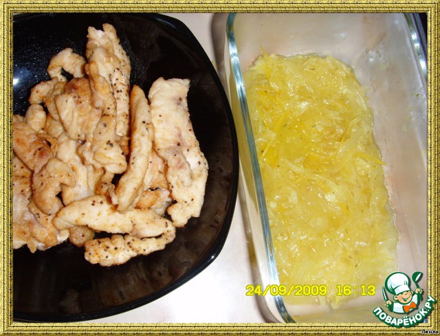 Сверху выложить куриное мясо. Сверху полить соусом что остался в сковороде. Еще немного посолить и поперчить на ваше усмотрение.Выпекать в духовке 30-45 минут. (написано было сбрызгивать духовку водой каждые 15 мин.) чётко придерживалась писаному ;-)