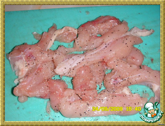 Помыть куриное мясо и высушить бумажными полотенцами. Немного посолить, поперчить(клала белый перец с лимоном).