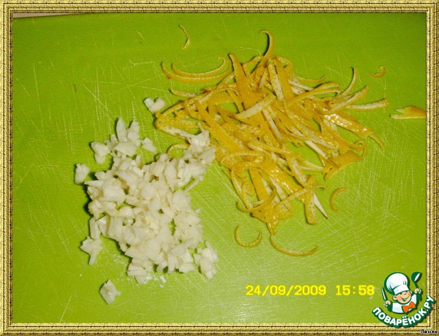 Лимонная кожура(снять кожуру, только желтую часть, и мелко нарезать),мелко нашинковать чеснок