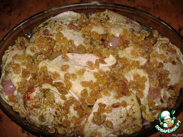 Изюм заливаем 330 гр. пива и добавляем туда столовую ложку сахара. Так изюм и замаринованные бедра стоят где-то 30 минут.