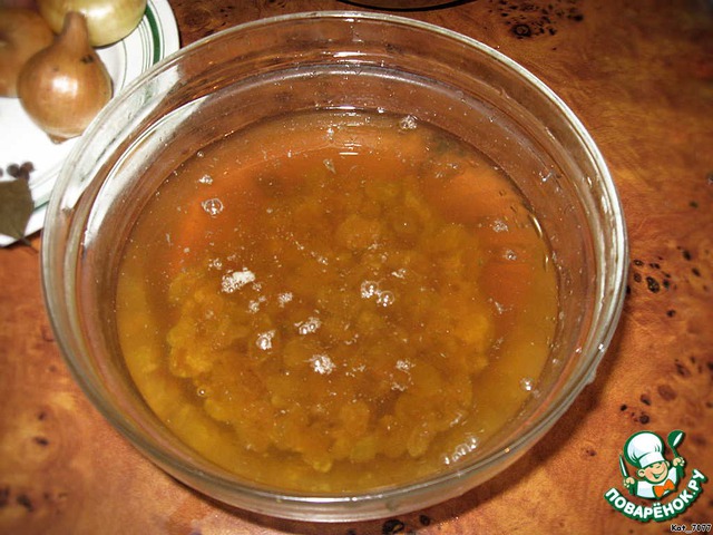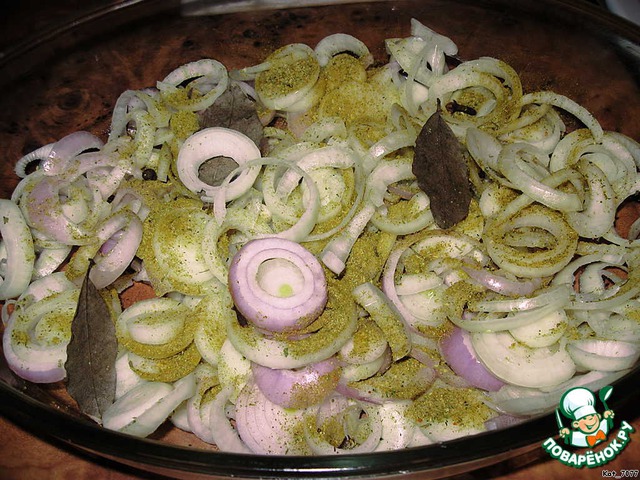 Тем временем чистим и режем лук кольцами. Укладываем в форму для запекания, посыпаем приправой и слегка посолить, плюс лаврушка, перец и гвоздичка.