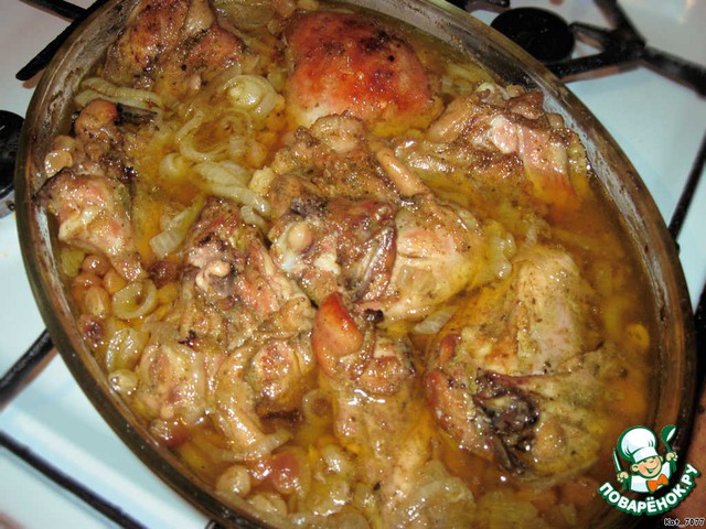 Заливаем пивом с изюмом. Ставим всё в духовку и тушим около 2 часов (пиво должно выветриться) при температуре 160 градусов. Первый час не трогаем, а в течение второго бедра нужно перевернуть 2 раза.