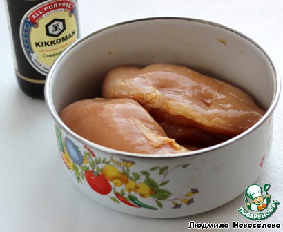 Куриное филе замариновать в соевом соусе и оставить на ночь в холодильнике.