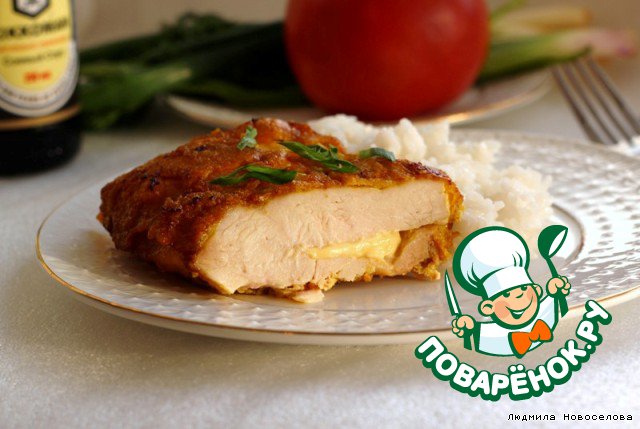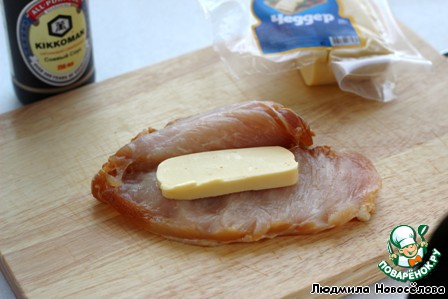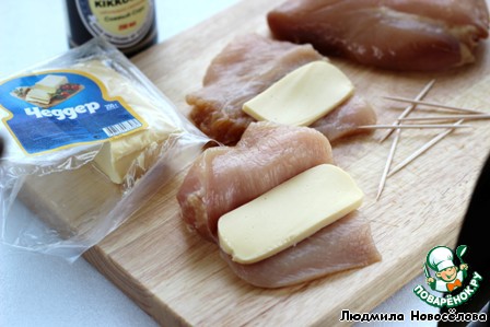 Филе грудки надрезать в виде кармашка или как книжка, вложить ломтик мягкого сыра.