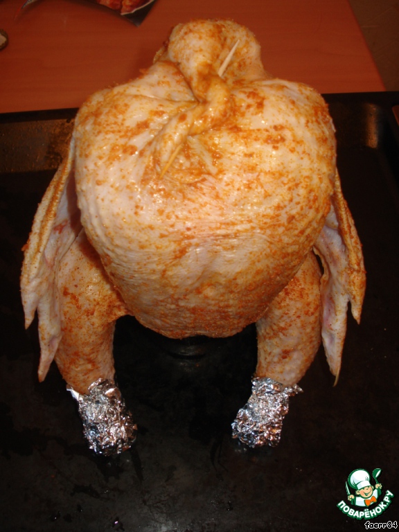 Смазываем специями, ставим на противень, в противень наливаем 2 стакана воды и отправляем в духовку на час (у меня запекалась 1час 20мин), периодически поливая соком из противня
