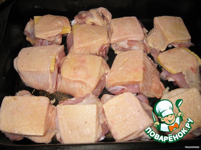 Закладываем кусочки сыра под шкурку бедрышек. Выкладываем бедрышки в форму для запекания.