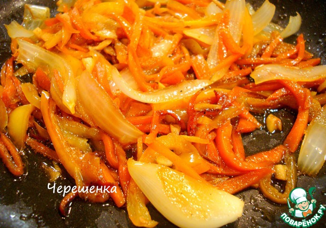 В оставшемся от жарки курицы жире потушить морковь (10минут), добавить лук, чеснок, болгарский перец и жгучий перчик, порезанный колечками. Обжарить на сильном огне пару минут, приправить хересом, соевым соусом и молотым черным перцем… а затем на маленьком огне тушить 8-10 минут…