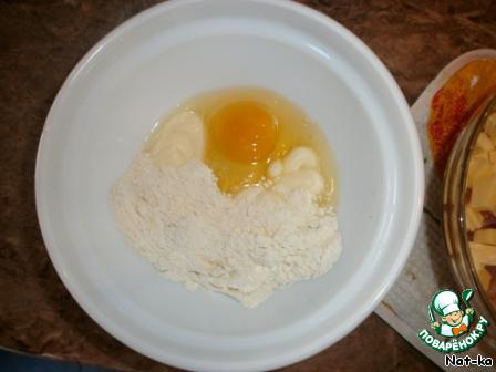 Далее готовим маринад. Для этого смешиваем в отдельной посудине яйцо, муку, майонез. Хорошо мешаем, солим, перчим по вкусу.