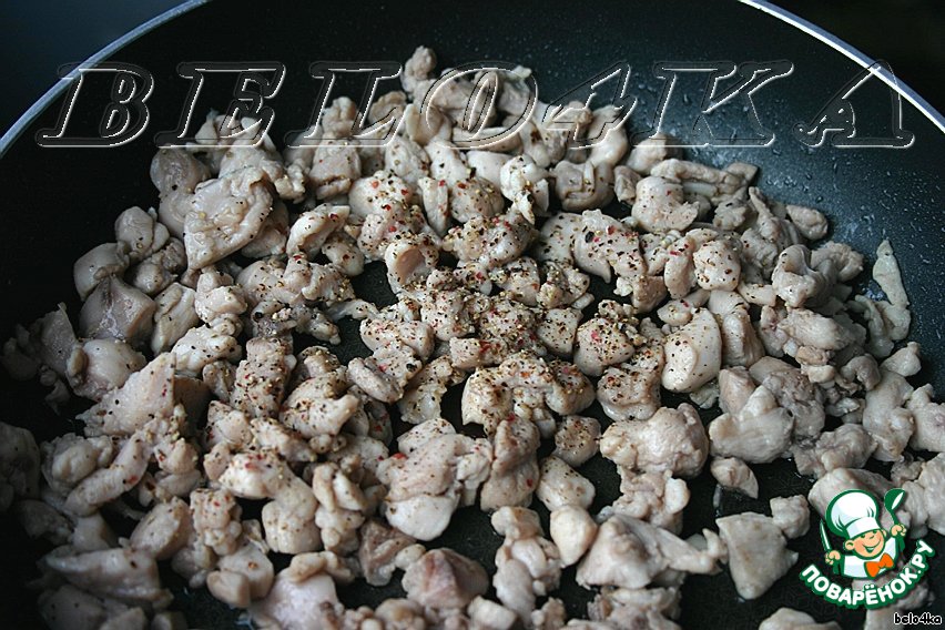 Куриное филе нарезать кубиками, посолить, поперчить и обжарить на растительном масле.